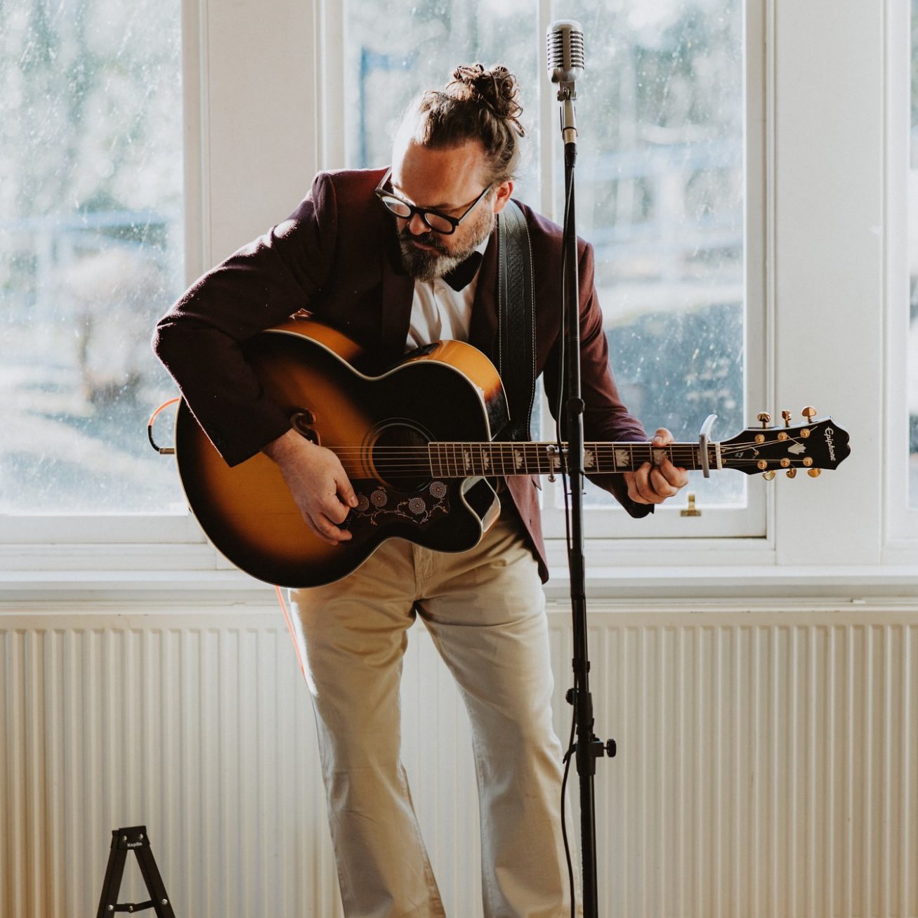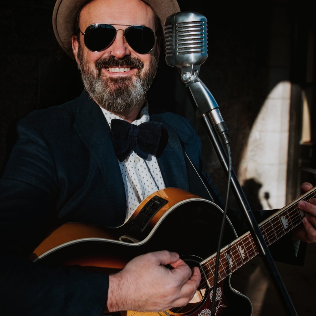 I don't use electronic backing tracks, I don't play cheesey wedding songs and I most certainly never try to drown out conversation. I play good songs, in the background of good parties. The songs you find yourself enjoying despite still being able to talk with family or friends.